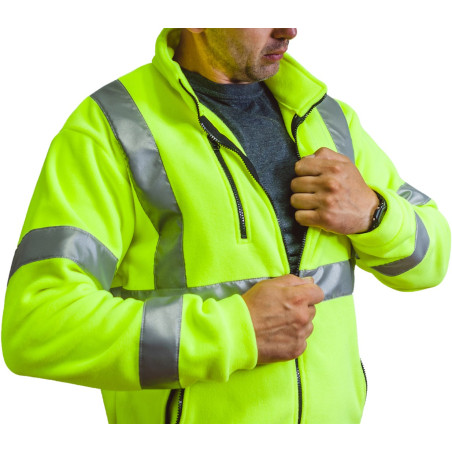 Polar wykonany jest z grubego, miękkiego materiału fluorescencyjnego o wysokiej gramaturze, który zapewnia ciepło w chłodniejszych warunkach. Elementy odblaskowe zwiększają widoczność przy słabym oświetleniu, dzięki czemu model ten wpisuje się w kategorię odzieży roboczej o wysokiej widoczności. Praktyczne kieszenie zapinane na zamek oraz regulacja dołu ułatwiają dopasowanie polaru i wygodne przechowywanie drobnych przedmiotów.